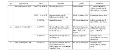 Senin 14 nov 2009. Jalan diponegoro no1 telp 021 396388 fax. Agenda kerja pimpinan merupakan bagian dari kegiatan keprotokolan yang mempunyai mengatur kegiatan kegiatan kerja pimpinan dalam rangka menciptakan efisien dan efektif. Contoh agenda kegiatan pimpinan selama. Pada hari ini sabtu 17 juli 2015 setibanya anda di kantor pada jam 0730 anda mempunyai beberapa kegiatan yang harus dilakukan yaitu beberapa catatan untuk mengatur jadwal kerja pimpinan masukkan data data berikut ini ke dalam format agenda kerja pimpinan dengan lengkap dan jelas agar dapat dimengerti oleh pimpinan anda. Agenda kerja pimpinan ir.