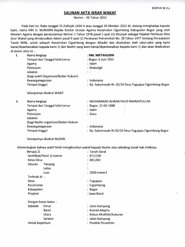 Contoh akta ikrar wakaf. Untuk menciptakan tertib hukum dan administrasi wakaf guna melindungi harta benda wakaf hal tersebut dapat dilihat adanya penegasan dalam undang undang ini agar wajib dicatat dan dituangkan dalam akta ikrar wakaf dan didaftarkan serta diumumkan yang pelaksanaannnya dilakukan sesuai dengan tata cara yang diatur dalam peraturan perundang undangan yang mengatur mengenai wakaf yang harus. Ikrar wakaf akta ikrar wakaf atau akta pengganti aiw asli dan copy. Contoh akta ikrar wakaf kua kandangan lembar pengamatan pembelajaran k 13. Hibah tanah tanah wakaf tanah warisan dan lain lain tanah merupakan aset yang sangat berharga yang dimiliki oleh seseorang bukan hanya menyangkut nilai pasar yang melekat terhadapnya namun manfaat manfaat serta hal hal plus yang terkandung di dalamnya yang mungkin bernilai lebih dari nilai tahah itu sendiri. Praktik wakaf umum dilakukan oleh orang orang di indonesia. Mari simak penjelasan lengkap mengenai syarat prosedur hingga contoh surat wakaf berikut ini.