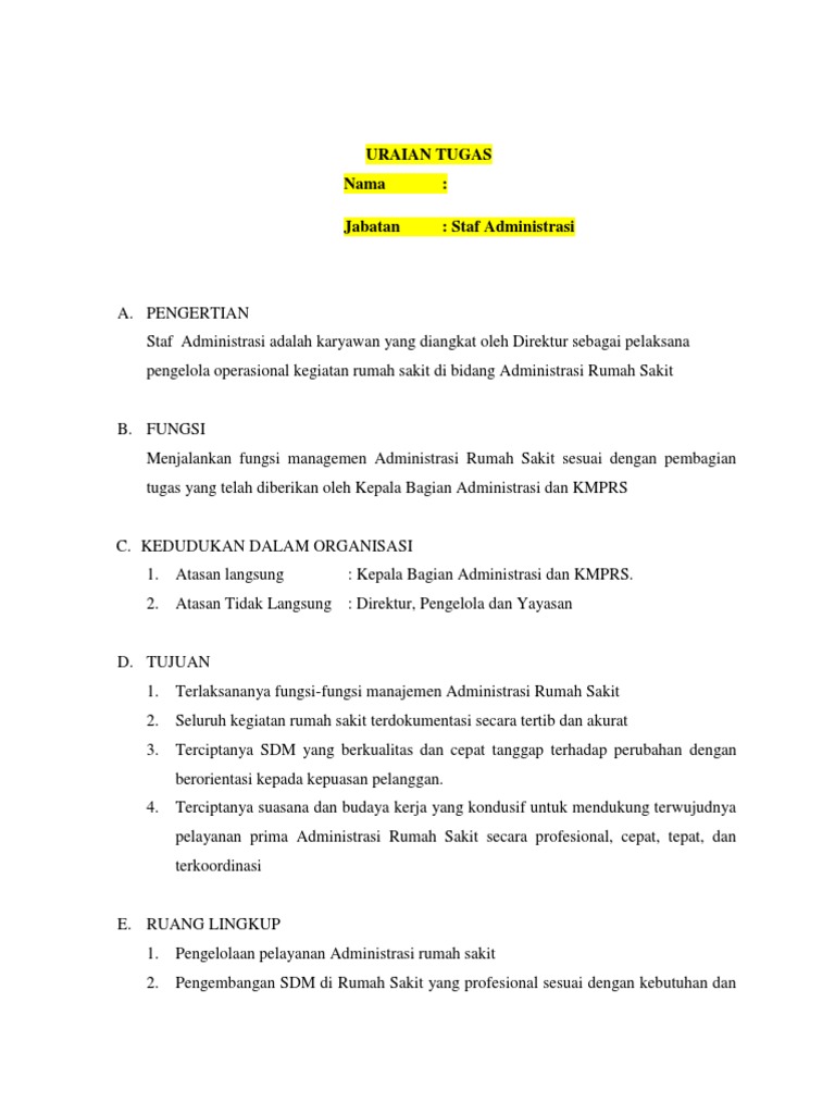 Contoh analisis jabatan staf administrasi. 1 instansi terkait di luar pemkot wewenang hubungan kerja tolok ukur keberhasilan nama jabatan rincian jabatan skpdunit kerja fungsi utama jabatan melaksanakan fungsi analisa data teknis dengan teori danatau hukum dengan metode analisis kuantitatif maupun kualitatif. Contoh soal tentang infeksi nasokimial. Analisis jabatan pengadministrasian umum. Analisis jabatan kepala tata usaha. Jenis jabatan kepala kantorpimpinan kantordirektur kantor pimpinan kantor adalah orang yang memantau dan bertanggung jawab terhadap kelancaran aktivitas kantor secara keseluruhan mengatur pembagian tugas pekerjaan personil mengatur mekanisme kerja dan pelengkapan kerja kantor sesuain kebutuhan. Menganalisis jabatantugasuraian pekerjaan pada kegiatan administrasi pengertian organisasi kantor istilah organisasi berasal dari bahasa yunani yaitu organon atau dalam bahasa latin organum yang berarti alat bagian anggota atau badan.