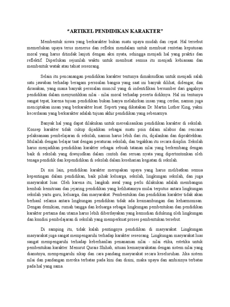 Contoh artikel pendidikan karakter. Artikel tentang pendidikan karakter karakter dapat diartikan sebagai cara pola berpikir dan berperilaku seseorang yang merupakan mencerminkan dirinya baik secara individu maupun secara bersama sama baik dalam lingkup keluarga masyarakat dan bernegara. Di sini kami akan memberikan contoh contoh artikel dengan pembahasan tentang pendidikan kesehatan dan ilmiah. Untuk lebih singkatnya karakter merupakan pembawaaan seseorang yang didapatkan sejak kecil. Kalaulah pendidikan karakter adalah hasil dari tindakan moral maka pendekatan pendidikan moral dapat digunakan untuk pendidikan karakter. Untuk memahami tentang karakter maka pahamilah berbagai hal yang berhubungan dengan konsep moral. Sebagai akibatnya anak bisa meraih keberhasilan serta kesuksesan dalam.