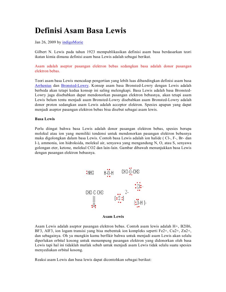 Teori asam basa menurut lewis 1923 pada tahun yang sama 1923 lewis mengajukan pandangan yang berbeda terhadap teori asam basa. Contoh asam lewis adalah h b 2 h 6 bf 3 aif 3 ion logam transisi yang bisa membentuk ion kompleks seperti fe 2 cu 2 zn 2 dan sebagainya.