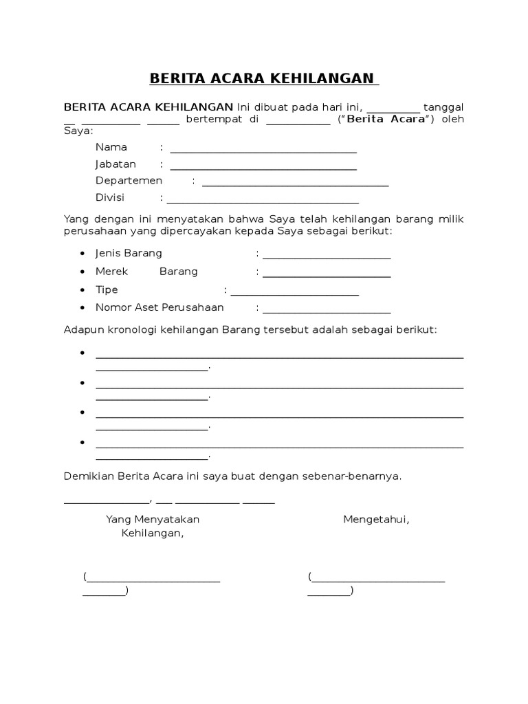 Contoh berita acara kehilangan. Terimakasih telah membaca artikel berita acara kehilangan barang. Berita acara serah terima hasil pekerjaan konstruksi berita acara serah terima hasil pekerjaan jasa desain website berita acara serah terima. Penting untuk diketahui sebelumnya surat berita acara kehilangan ini merupakan surat yang sifatnya resmi dan dapat bersifat hukum. Contoh contoh yang akan dipaparkan di bawah ini terdiri dari jenis contoh berita acara rapat serah terima kejadian kehilangan serah terima sebuah pekerjaan kerusakan barang acara kehilangan dokumen penting acara kegiatan sekolah contoh untuk jenis berita acara pemeriksaan dan masih banyak lagi yang lainnya. Contoh berita acara berita acara adalah sebuah naskah dinas atau surat yang di dalamnya memuat pernyataan pengesahan tentang suatu kegiatan rapat kehilangan kerusakan dan serah terima barang penyelesaian pekerjaan kejadian peristiwa perubahan status dll. Panduan teknis membuat berita acara download draf berita acara lainnya.