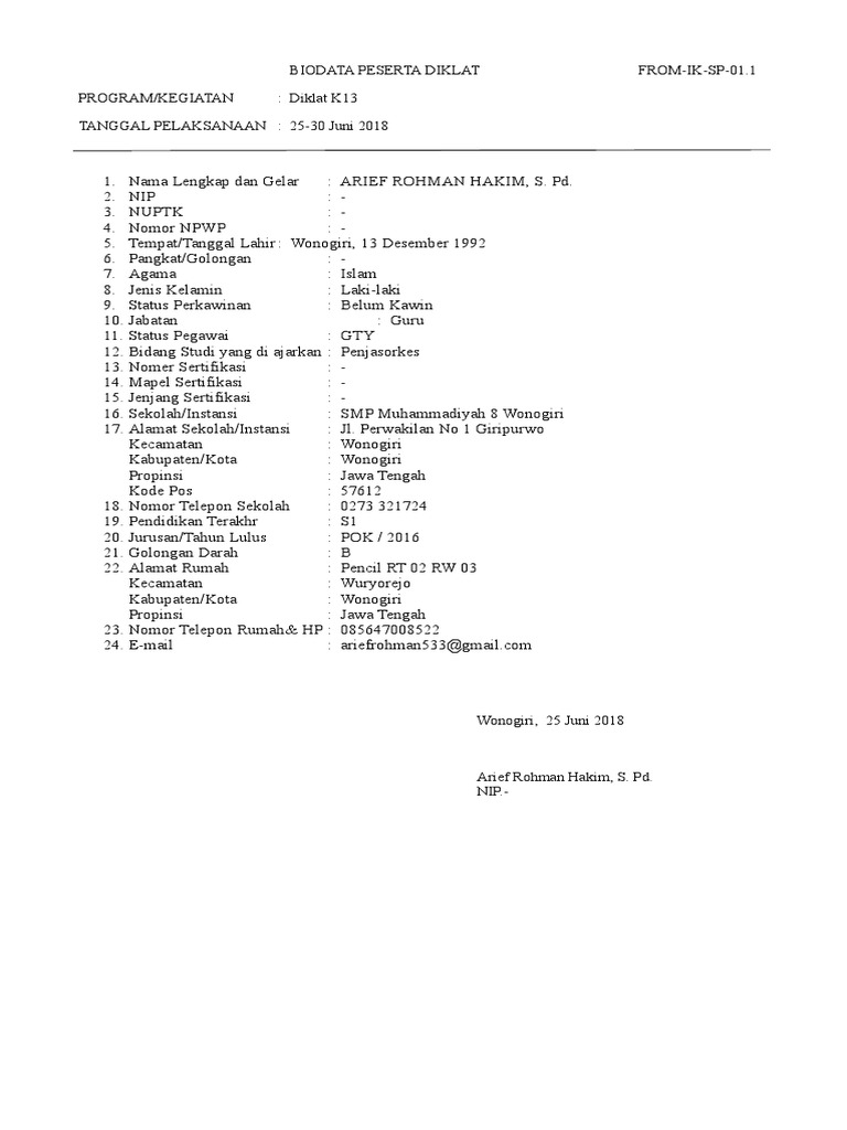Selengkapnya bagi yang sedang membutuhkan file tersebut dilahkan dapatkan secara lengkap dan gratis dengan cara klik saja pada tautan yang telah kami cantumkan dibawah ini. Biodata peserta pelatihan author. Untuk mengisi biodata diwajibkan untuk login akun google terlebih dahulu. Isi biodata peserta diklat fungsional untuk peserta diklat fungsional harap mengisi surat pernyataan peserta dan surat pernyataan pimpinan download. Contoh biodata diri terbaru dan lengkap biodata diri sering kali digunakan untuk informasi penting tentang data diri anda yang biasanya dibutuhkan dalam sebuah identitas atau dalam sebuah formulircontoh biodata biasanya diperlukan untuk mendaftar sekolah atau untuk melamar sebuah pekerjaan. Sarana dan prasarana pelatihan.