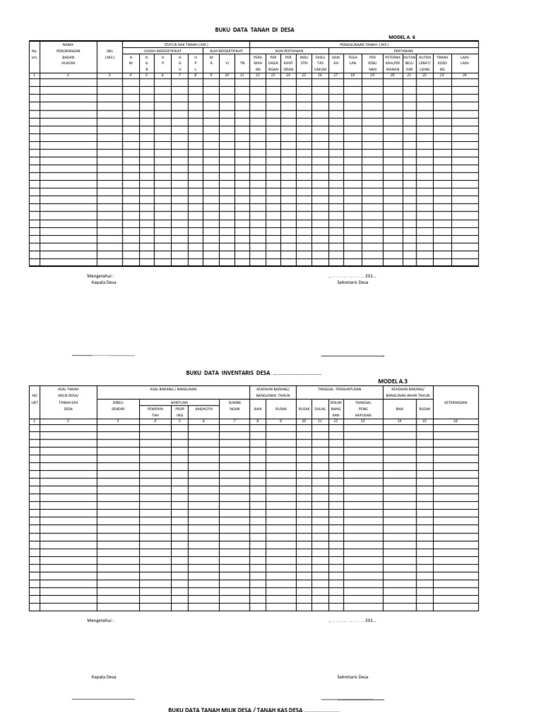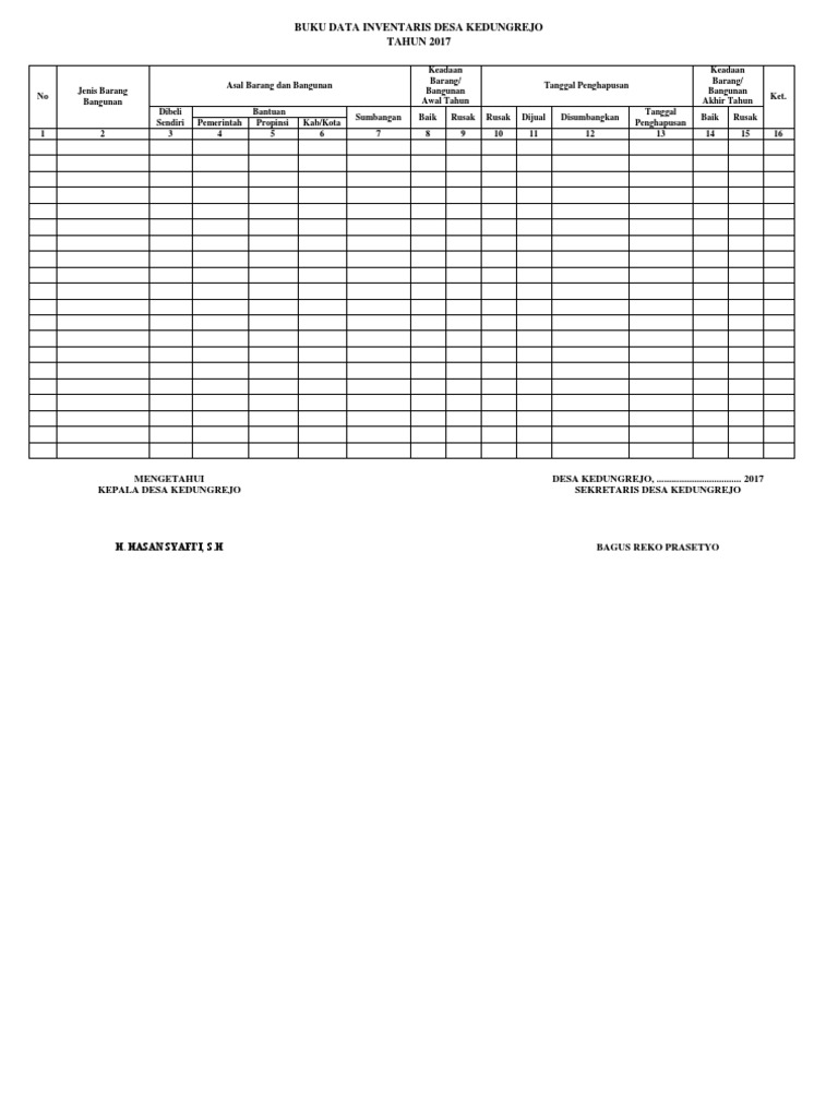 Aset desa adalah barang milik desa yang berasal dari kekayaan asli desa dibeli atau diperoleh atas beban anggaran pendapatan dan belanja desa atau perolehan hak lainnya yang sah. Kartu inventaris barang contoh buku inventaris barangperlengkapan sekolah paud tk kb tpa sps. Setiap koleksi barang atau perlengkapan yang menjadi milik lembaga paud harus didaftardiinventarisir untuk memudahkan lembaga mengetahui kondisi barang saat ini. Nah sambil menunggu peraturan bupati walikota yang mengatur administrasi pemerintahan desa ada baiknya kita simak lampiran permendagri 472016 yang berisi contoh format dan cara pengisian buku administrasi desa. Sebagai bagian dari format administrasi pemerintahan desa buku administrasi umum tentu memiliki peran dan kedudukan yang penting di desauntuk itu sangat perlu dimiliki bagi siapa yang ditugaskan untuk mengelola dan mengisi buku buku administrasi umum ini. Yang penting hasilnya seperti yg tampil di halaman inventaris dan di buku inventaris dan kekayaan desa.