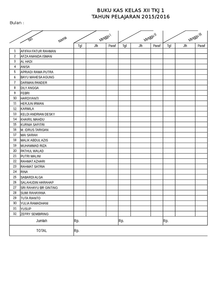 Kas adalah alat pembayaran yang syah di indonesia dan barang barang lain yang dapat segera diuangkan sebesar nilai nominalnya dan dapat digunakan untuk membayar utang jangka pendek dengan demikian yang termasuk ke dalam kas adalah uang kertas uang logam cek segala macam cek dalam rupiah kecuali cek mundur dan wesel pos yang diterima dari pihak lain serta saldo di bank yang bebas diambil. File buku kas kelas ini dapat digunakan untuk anak smp mts sma dan smk silahkan download melalui link ini. Home contoh buku kas contoh buku kas harian contoh buku kas kecil contoh buku kas kelas per bulan contoh buku kas kelas per minggu contoh buku kas kelas per minggu di buku tulis contoh buku kas sederhana contoh buku kas umum contoh buku kas umum bos 2019 contoh buku kas umum bos 2020 contoh buku kas. Download contoh buku kas kelas contoh buku kas kelas peulis cilikxlsx downloaded 1791 times 14 kb. Buku kas umum dalam suatu instansi baik pemerintah maupun swasta sebagai pengelolaan uang atau harta perusahaan merupakan suatu hal yang penting untuk dipertanggungjawabkan. Harta dalam suatu instansi atau perusahaan bisa kita sebut.