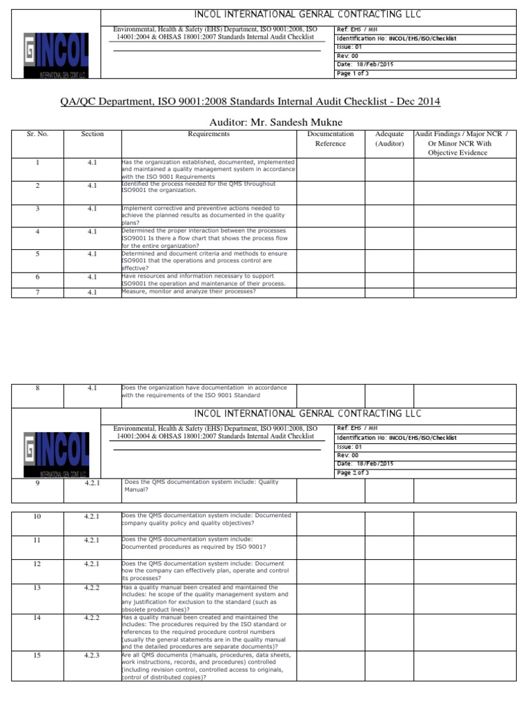 Contoh checklist internal audit iso 9001 2015. Sebuah daftar checklist yang dirancang dengan baik akan memberikan auditor internal dengan rekomendasi dari apa dokumen untuk mencari contoh apa yang akan memenuhi persyaratan dan panduan lain pada audit internal dengan standar. Pertanyaan internal audit iso 90012015. The general guidance and examples shown in column e should be referred to when undertaking an internal audit as described by iso 90012015 clause 92. By nimonik iso 90012015 free checklist internal quality management system audit. Insert your companys name or logo. Supaya auditor internal fokus dalam mengaudit maka penting seorang auditor internal membuat checklist pertanyaan yang sesuai dengan persyaratan iso 90012015.