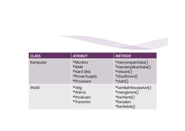 Method adalah tindakan yang bisa dilakukan di dalam classjika menggunakan analogi class laptop kita maka contoh method adalah. Dalam contoh diatas miaow hungry dan sleeping adalah method. Class didefinisikan dengan kata kunci class. Class kelas adalah kerangka dasar dari objek yang akan diciptakan bisa berupa struktur yang mendefinisikan data atau method dari objek. Contoh sederhana dari deklarasi sebuah. Artinya kita bisa membuat banyak objek dari suatu class.