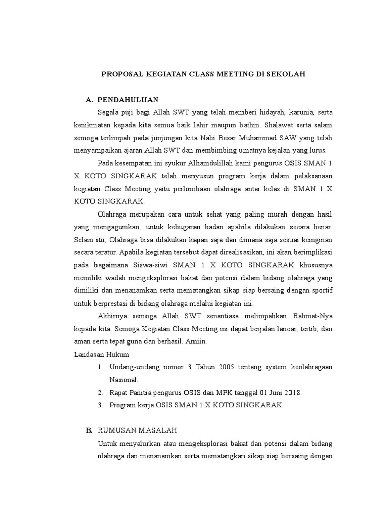 Proposal kegiatan untuk sekolah dibuat ketika sebuah sekolah atau lembaga pendidikan sedang melakukan suatu kegiatan. Jika kamu ingin membuat suatu kegiatan maka kamu harus membuat proposal. Dalam hal ini akan kami sajikan sebagai salah satu refrensi sahabat dalam membuat sebuah proposal pengajuan dana atau bantuan dengan baik dan benar. Kemampuan smp negeri 2 puhpelem dalam menjaga. Contoh proposal kegiatan ulang tahun sekolah. Mulai dari contoh proposal kegiatan festival musik contoh proposal kegiatan class meeting contoh proposal kegiatan bazar conto proposal kegiatan mahasiswa contoh proposal kegiatan karang taruna contoh proposal kegiatan olahraga pameran seni rupa ulang tahun sekolah kerja bakti gotong royong penghijauan dll.