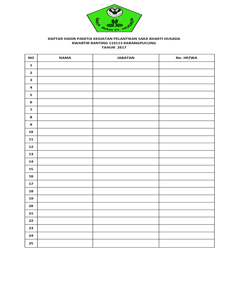 Contoh daftar hadir kegiatan. Yang terpenting ada tanda tangan nya saja. Contoh format daftar hadir absensi siswa di microsoft excel bagi seorang guru tetunya kegiatan sehari dalam mengajar siswa pastinya ada kegiatan absensi atau memerikasa kehadiran siswa nyarange kehadiran siswa mungkin berbeda bedamaka saya akan memberikan contoh daftar absensi siswa yang mungkin di butuhkan untuk melengkapi berkas berkas di sekolahtentunya guru sangat memperhatikan. Free download contoh daftar hadir rapat. Inilah deretan contoh daftar hadir kegiatan pada umumnya daftar hadir ini di pergunakan untuk pendaftaran dalam menghadiri suatu event atau kegiatan seperti perumusan visi misi pengembangan kurikulum pramuka pmr pmii donor darah cfd dan lain sebagainya. Bagi suatu permasalahan masalah baik berupa pelaksanaan perencanaan ataupun pengendalian kebijaksaan pimpinan. Diharapkan dengan artikel berjudul contoh sk berita acara daftar hadir tim pengembang kurikulum ini bisa memberikan manfaat banyak untuk anda dalam menunjang kinerja anda sebagai pendidik dan tenaga kependidikan.