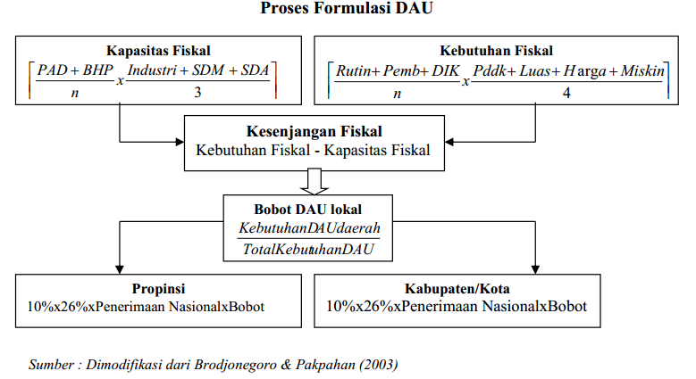 Dana alokasi umum dau dialokasikan untuk provinsi dan kabupatenkota. Total nilai dau di dalam apbn ditetapkan minimal 26 dari pendapatan dalam negeri netto. Dana alokasi umum dau merupakan block grant yang diberikan kepada semua kabupaten dan kota untuk tujuan mengisi kesenjangan antara kapasitas dan kebutuhan fiskalnya dan didistribusikan dengan formula berdasarkan prinsip prinsip tertentu yang secara umum mengindikasikan bahwa daerah miskin dan terbelakang harus menerima lebih banyak daripada daerah kaya. Dak termasuk dana perimbangan di samping dana alokasi umum dau. Dak termasuk di dalam dana perimbangan di samping dana alokasi umum dau. Dana alokasi umum dau adalah dana yang dialokasikan dalam apbn kepada daerah dengan tujuan pemerataan kemampuan keuangan antardaerah untuk mendanai kebutuhan daerah dalam rangka pelaksanaan desentralisasi.