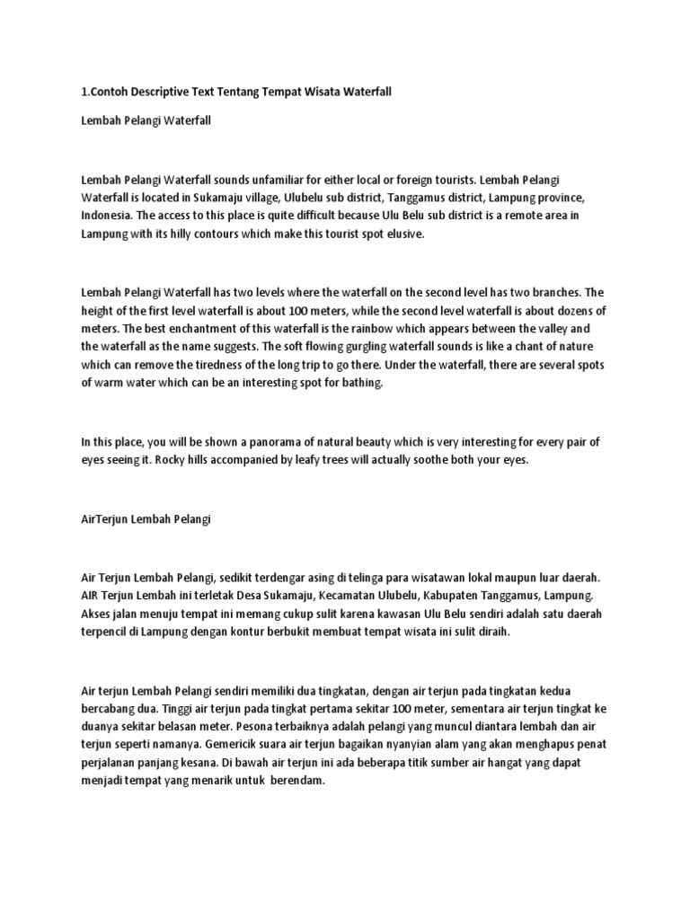 Example of descriptive text contoh descriptive text kali ini merupakan kumpulan contoh teks descriptive yang akan mendeskripsikan 10 tempat liburan paling ciamik yang dimiliki indonesia. Contoh text descriptive pada posting ini saya buat berbeda dari contoh text descriptive popular yang telah dibuat oleh situs situs lain. Lembah pelangi waterfall is located in sukamaju village ulubelu sub district tanggamus district lampung province indonesia. Anda berada ditempat yang benar. The national monument indonesian. Untuk membuat contoh descriptive text dalam bahasa inggris kamu wajib tahu 7 rahasia tersembunyi dari kesederhanaan kalimat present tense yang bikin kamu makin paham.