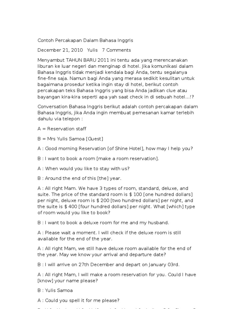 Demikian dialog pendek bahasa inggris dengan menggunakan materi appointment. Contoh percakapan bahasa indonesia 2 3 4 orang singkat pendek salamadian februari 4 2019 0 percakapan bahasa indonesia percakapan atau dialog ialah sebuah materi dasar yang wajib dikuasai oleh seorang siswa. Dialog singkat reservation hotel jika anda hendak menjadi seorang resepsionis hotel maka memiliki kemampuan berbahasa inggris yang aktif adalah sebuah keharusan karena akan banyak tamu hotel yang datang dari luar negeri sehingga harus bisa berbicara dalam bahasa inggris speaking. Contoh dialog reservation pendek. 3 contoh dialog percakapan bahasa inggris di restoran lengkap beserta artinya sahabat kbi dialog bahasa inggris di restoran memang sering kita lakukan dalam sehari hari. 47 5 101 votes dear readers hotel berasal dari kata hostel konon diambil dari bahasa perancis kuno.