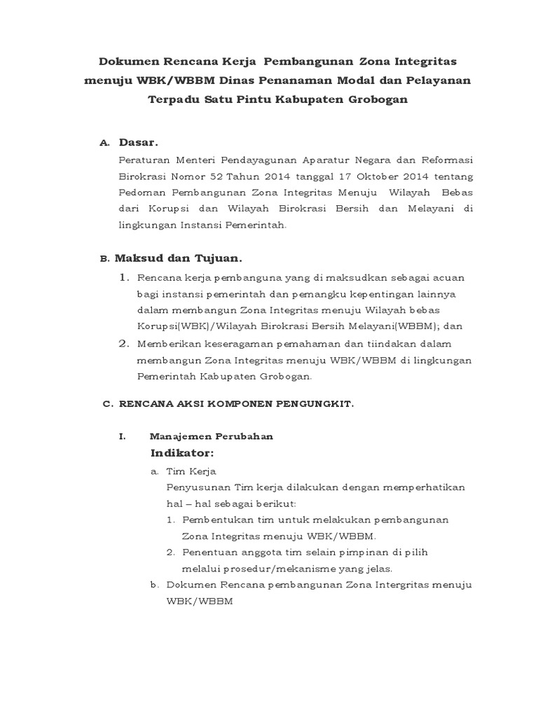 Penyusunan dokumen rencana kerja pembangunan zona integritas menuju wbkwbbm 2. Ukur indikator hasil dan proses yang dicapai. Tetapkan rencana aksi reformasi birokrasi untuk unit kerja zona integritas. Pedoman pembangunan zona integritas menuju wilayah bebas dari korupsi wbk dan wilayah birokrasi bersih dan melayani wbbm. 2 dokumen rencana pembangunan zona integritas 1 10 a. Dokumen rencana kerja pembangunan zona integritas menuju wilayah bebas dari korupsi wbkwilayah birokrasi bersih dan melayani wbbm dinas lingkungan hidup kabupaten tanah bumbu kabupaten tanah bumbu februari 2017.