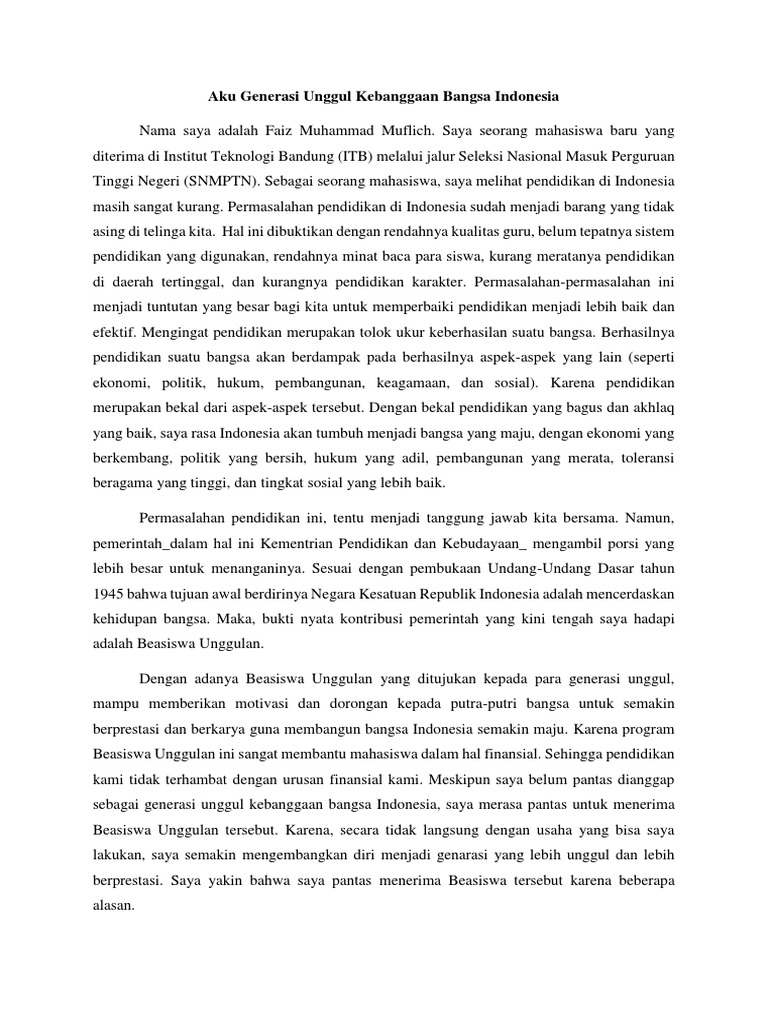 Contoh essay beasiswa unggulan aku generasi unggul kebanggaan bangsa indonesia aku generasi unggul kebanggaan bangsa indonesia indonesia adalah negara kepulauan terbesar di dunia dengan luas wilayah perairan hampir 70 persen dari luas keseluruhan indonesia. Aku generasi unggul kebanggaan bangsa indonesia esai ini saya tulis sebagai salah satu syarat untuk mengikuti beasiswa unggul masyarakat unggul beprestasi tahun 20162017. Aku generasi unggul kebanggaan indonesia saya adalah bagian dari generasi masa depan bangsa besar indonesia. Aku generasi unggul kebanggaan bangsa indonesia indonesia adalah negara kepulauan terbesar di dunia dengan luas wilayah perairan hampir 70 persen dari luas keseluruhan indonesia.