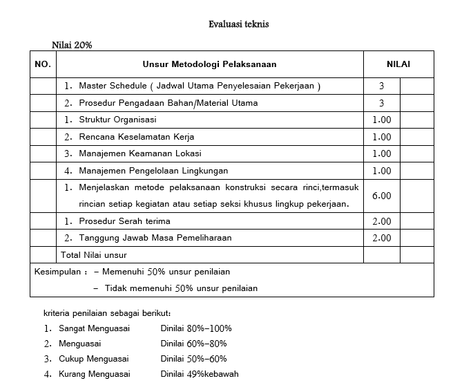 Bagi yang memenuhi syarat administrasi kualifikasi dilakukan evaluasi persyaratan teknis kualifikasi. 1 bobot kualitas penawaran teknis antara 060 sampai 080. Kami ingin bertanyamengenai evaluasi pada jasa konsultansi yang masih membingunkan kami adalah perbedaan evaluasi pagu anggaran dan evaluasi kualitias. Contoh contoh yang termasuk jasa konsultansi adalah sebagai berikut. A teknis 80 rp.