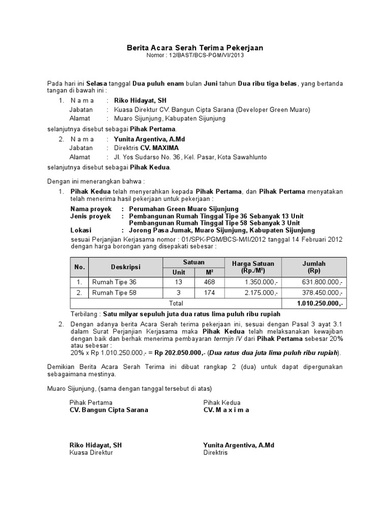 Contoh format berita acara serah terima pekerjaan. Contoh berita acara serah terima pekerjaan related posts to contoh berita acara serah terima pekerjaan resign contoh berita acara serah terima pekerjaan resign 2016 12 11t074900 0800 rating. Contoh ini bisa anda perbarui sesuai dengan kebutuhan anda misalnya menjadi contoh berita acara serah terima pekerjaan borongan atau contoh berita acara serah terima pekerjaan retensi. Berita acara serah terima jabatan pada bagian ini merupakan pembuktian secara formal adanya pelimpahan jabatan dari pihak pertama sebagai yang menyerahkan kepada pihak kedua sebagai yang menerima dengan detail berisi tugas kewajiban kewenangan dan juga tanggung jawab yang didokumentasikan dan diarsipkan. Berita acara serah terima pekerjaan memuat keterangan yang begitu detail dan penting bahkan banyak yang menggolongkannya sebagai dokumen tentang kronologi kepentingan pekerjaan. Surat berita acara serah terima pekerjaan proyek memiliki fungsi yang sama seperti kuitansi dimana pada saat suatu pekerjaan proyek telah diselesaikan dan hendak diberikan kepada pihak pemilik proyek maka akan diberikan sebuah surat serah terima. Demikianlah berita acara serah terima barang ini di perbuat oleh kedua belah pihak adapun barang barang tersebut dalam keadaan baik dan cukup sejak penandatanganan berita acara ini maka barang tersebut menjadi tanggung jawab pihak kedua memlihara merawat dengan baik serta dipergunakan untuk keperluan tempat dimana barang itu dibutuhkan.