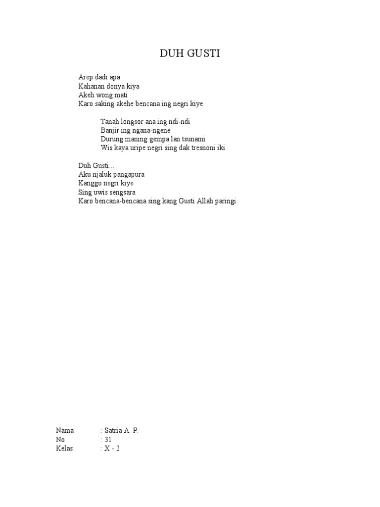 Puisi bahasa jawa puisi bahasa jawa biasa disebut dengan geguritan adalah bentuk puisi yang berkembang di kalangan masyarakat penutur bahasa jawa dan bali. Geguritan berkembang dari tembang jawa yaitu liriksajak yang mempunyai irama nada dalam bahasa indonesia disebut lagu.