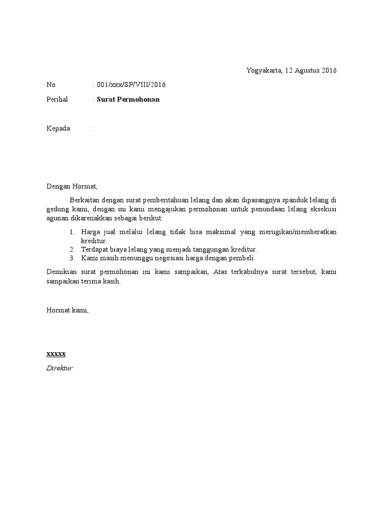 Contoh surat pembatalan lelang bcf 15 untuk barang import yang telah di kuasai negara dalam hali ini yang berwenang melakukannya adalah direktorat bea cukaisurat lelang bcf 15 di dasari dari peraturan direktorat jendral bea dan cukai dengan nomor peraturan. Contoh surat wasiat tanah untuk istri contoh surat wasiat harta warisan yang dibuat sendiri dan di titipkan ke notaris agar memiliki kekuatan hukum yang lebih tinggicontoh surat wasiat. Mohon maaf apabila terdapat kesamaan nama tempat ataupun informasi di dalamnya karena semua surat hanya bersifat percontohan saja tanpa ada maksud apapun. Gugatan perdata masalah hutang masalah penipuan masalah tanah surat gugatan. Contoh surat lelang adalah penjualan barang yang terbuka untuk umum dengan penawaran harga secara tertulis danatau lisan yang semakin meningkat atau menurun untuk mencapai harga tertinggi yang didahului dengan pengumuman lelang. Pembatalan lelang sebagaimana dimaksud pada ayat 1 disampaikan secara tertulis dengan disertai alasan dan harus sudah diterima oleh pejabat lelang paling lama sebelum lelang dimulai.