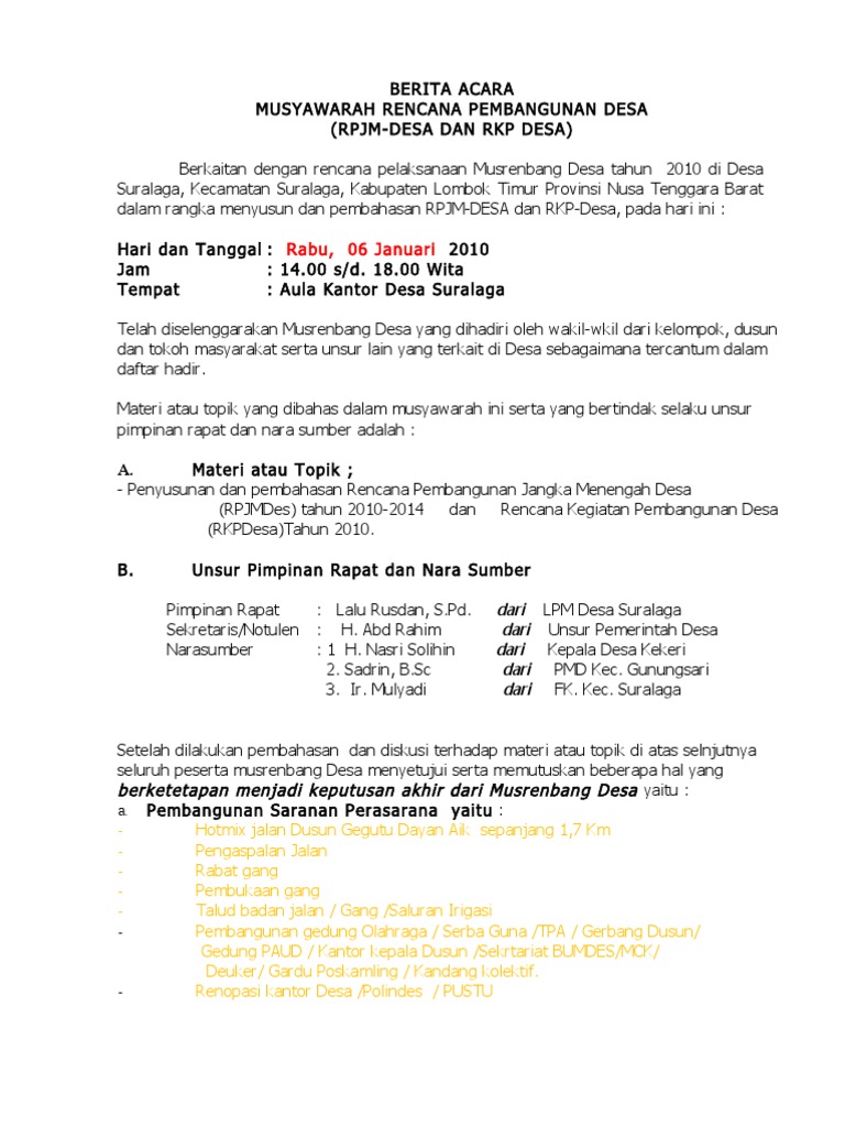 Contoh hasil musrenbang desa. Bentuk laporan rpjm desa dan rkp desa 1. Menyepakati prioritas usulan hasil musrenbang desa yang akan menjadi prioritas pembangunan kecamatan. 662007 atau peraturan kades berdasar pp no. 1 penerbitan sk kades untuk tim delegasi desa. Contoh notulen rapat musyawarah desa dimana biasanya akan digunakan ketika sudah menyusun pemerintahan atau perangkat desa dimana saja. Contoh berita acara musyawarah desa berkaitan dengan pelaksanaan program pembangunan infrastruktur perdesaa n tahun 2013 di desa klampisan kecamatan kandangan kabupaten kediri provinsi jawa timur maka pada hari ini.