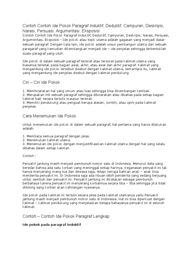 Dalam satu paragraf hanya ada satu ide pokok. Selain itu ide pokok merupakan bagian dari kalimat utama yang menjadi inti dari sebuah bacaan. Nama lain ide pokok adalah gagasan utama gagasan pokok. Fungsi contoh dan cara membuatnya. Makanya nama lain ide pokok adalah gagasan utama. Paragraf harus hanya memuat satu ide pokok yang dituangkan dalam kalimat pertama pada paragraf tersebut.