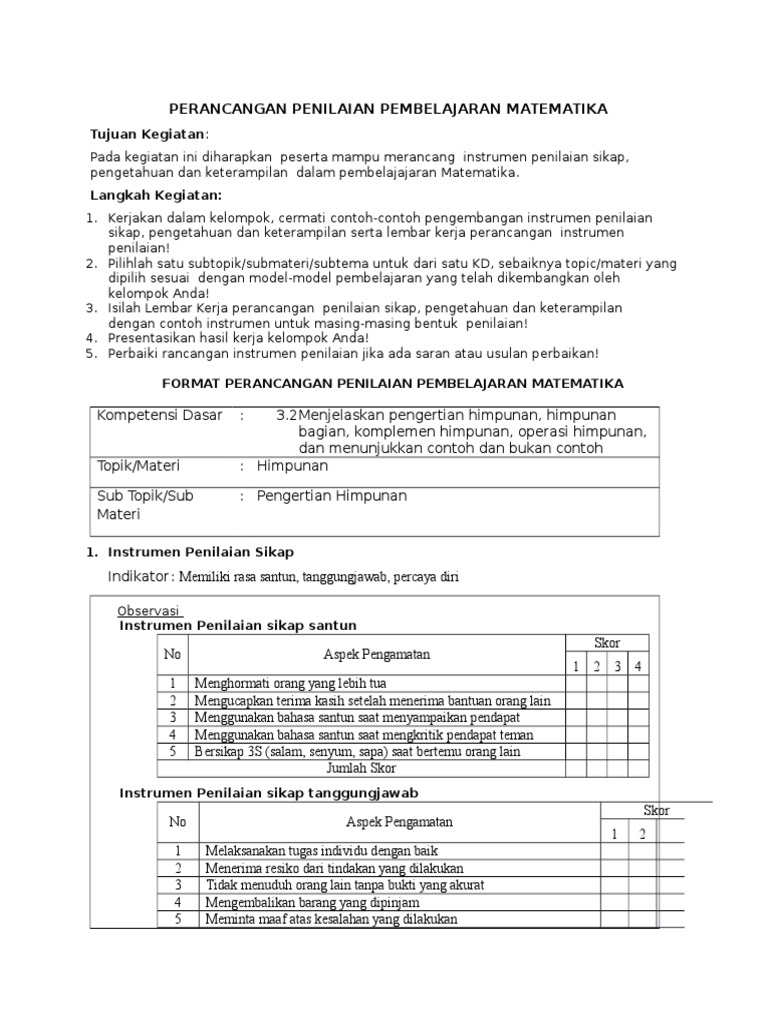 Contoh instrumen penilaian keterampilan matematika. Penilaian hasil belajar matematika sma. Teknik penskoran untuk penilaian ranah afektif dapat dilakukan secara sederhana. Untuk selengkapnya kami akan memberikan contoh rubrik dan lembar penilaian sikap pengetahuan dan keterampilan dibawah ini. Penilaian psikomotor dapat berupa penilaian tertulis penilaian identifikasi penilaian simulasi dan penilaian contoh kerja. Peserta diklat merevisi contoh butir instrumen berdasar masaukan saat presentasi 1. Lembar kerja 4 instrumen penilaian sikap pengetahuan dan ketrampilan penentuan teknik dan bentuk penilaian mata pelajaran.