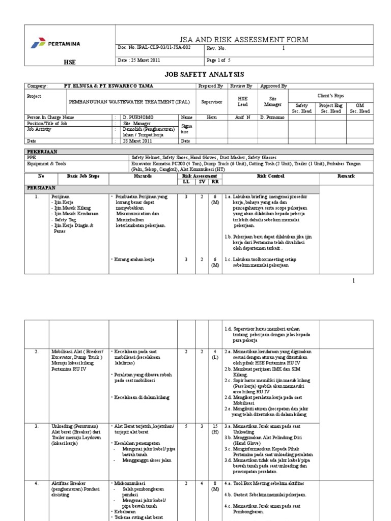 Konstruksi pertanian dan pembuangan merupakan yang berkontribusi terbesar yaitu 5034 juta dan 9 fatality dan 115379 pekerja lainnya terluka yang menyebabkan hilangnya 44 juta hari kerja hilang health and safety executive. Jsashe045 no revisi direview tanda. Ddmmyyyy ddmmyyyy departemen. Cara membuat jsa job safety analysis atau sering disingkat dengan jsa merupakan salah satu jenis prosedur kerja yang banyak digunakan di industri pertambangan perminyakan maupun konstruksi. Contoh jsa atau job safety analysis diperlukan sebagai referensi atau sekedar penambah jsa yang telah kita buat. All no jsa.