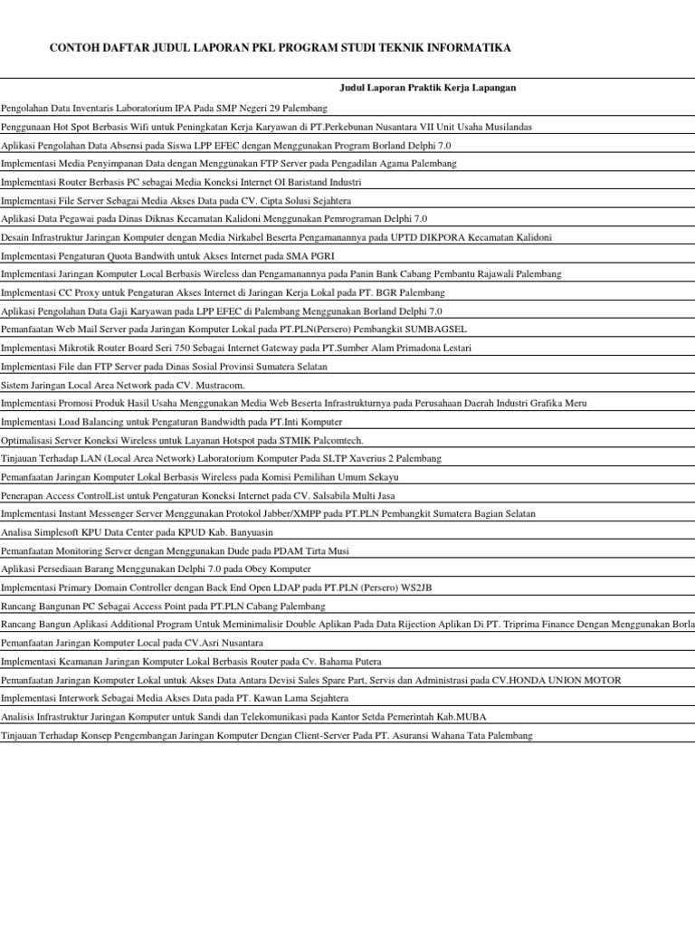 Judul laporan pkl biasanya ditulis mengiakan huruf kapital selain itu kamu juga harus memberi tahu dimana tempat kamu melaksanakan kegiatan pkl atau magang dengan cara menambahkannya dengan menggunakan kata penghubung di. Tips dan contoh judul laporan prakerinpkl smk baik dan benar tips memilih judul laporan prakerinpkl smk baik dan benar sebagai siswa smk tentunya pasti kita akan mengalami yang namanya prakerin yang dilaksanakan ditempat tempat kerja yang sesuai dengan kompetensi kita nah dan biasanya. Magang adalah kegiatan yang dilakukan mahasiswa tingkat akhir atau siswa smk kelas 3 dimana mereka mencari pengalaman kerja dengan langsung terjun ke lingkungan pekerjaan atau sering disebut praktek kerja lapangan pkl. Laporan ini disusun sebagai salah satu persyaratan mengikuti uji kompetensi di smkn 4 dumai tahun pelajaran 2012 2013. Tips dan contoh judul laporan prakerinpkl smk baik dan benar by admin on monday march 14th 2016. Kegiatan prakerin dimaksudkan sebagai salah satu bekal dalam memasuki jenjang dunia usaha atau dunia industri dan untuk memupuk sikap mental yang lebih baik dalam melaksanakan kewajiban sebagai penerus bangsa sehingga mampu dan siap bekerja.