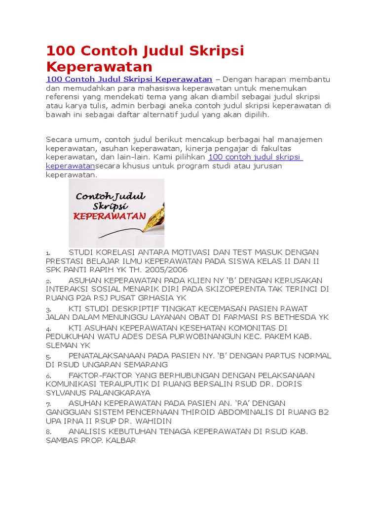450 contoh judul skripsi keperawatan gratis terbaru most recommended. Hubungan pengetahuan ibu tentang manajemen laktasi dengan perilaku dalam pemberian asi di desa kenokorejo polokarto sukoharjo. Contoh judul skripsi keperawatan terbaru mudah dikerjakan kumpulan contoh judul proposal skripsi keperawatan untuk temen temen mahasiswa jurusan keperawatan. Memang saya harus sedikit lebih teliti dan bekerja sebaik baiknya untuk menyajikan ke hadapan kakak semua artikel yang berjudul 450 contoh judul skripsi keperawatan gratis terbaru most recommended ini. Skripsi keperawatan mencakup berbagai hal yang menyangkut manajemen keperawatan seperti kinerja pengajar di fakultas keperawatan hubungan antara stres kerja dan motivasi terhadap kinerja pengajar di fakultas keperawatan gaya kepemimpinan dan faktor faktor yang mempengaruhi kinerja serta masih banyak lagi. Judul skripsi keperawatan anak yang kami share berikut ini menjadi beberapa judul skripsi keperawatan yang kerap dipilih untuk diteliti sebagai prasyarat menyelesaikan program strata satu s 1 keperawatan.