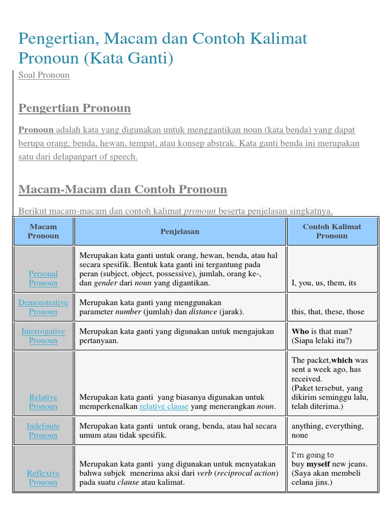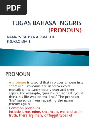 Tanpa pronoun kita akan terus mengulang ulang nama atau kata dalam suatu kalimat. Ada beberapa macam pronoun yang bisa kita pelajari yakni personal hellip.