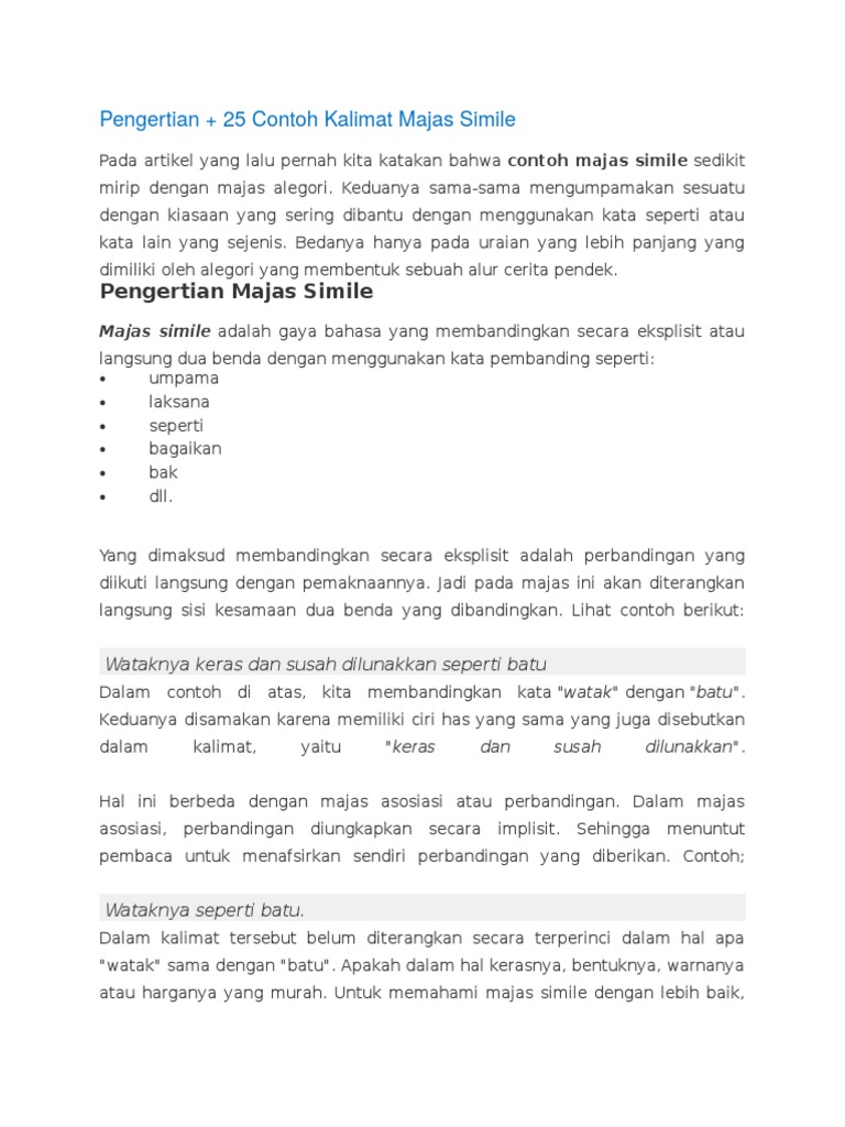 Gaya bahasa yang menarik tentunya akan. Untuk lebih memahami tentang majas simile serta penggunaannya dalam kalimat perhatikan contoh dibawah ini. Pengertian 25 contoh kalimat majas simile pada artikel yang lalu pernah kita katakan bahwa contoh majas simile sedikit mirip dengan majas alegori. Saya juga akan memberikan penjelasan tentang pengertian majas simile. Kata kata yang keluar dari mulutmu benar benar tajam dan menyakitkan hatiku bagaikan disayat pisau belati. Contoh kalimat majas antiklimaks.