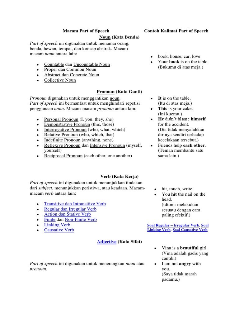 Hal ini juga penting dipelajari bagi yang baru belajar bahasa inggris karena kita perlu memahami bagian bagian kalimat yang membentuk kalimat tersebut secara utuh dan benar. Part of speech adalah pengelompokan kata berdasarkan fungsi masing masing dalam sebuah kalimat. Pengertian dari part of speech secara bahasa parts of speech berarti bagian bagian kalimat. Macam macam parts of speech penggunaan dan contoh kalimat delapan part of speech 1. Noun juga dapat berbentuk singular atau plural dan konkrit atau abstrakdalam suatu kalimat noun dapat berfungsi sebagai subjek objek langsung objek tidak langsung pelengkap subjek atau objek dari suatu preposisi. Riska is an intelligent student in the class.