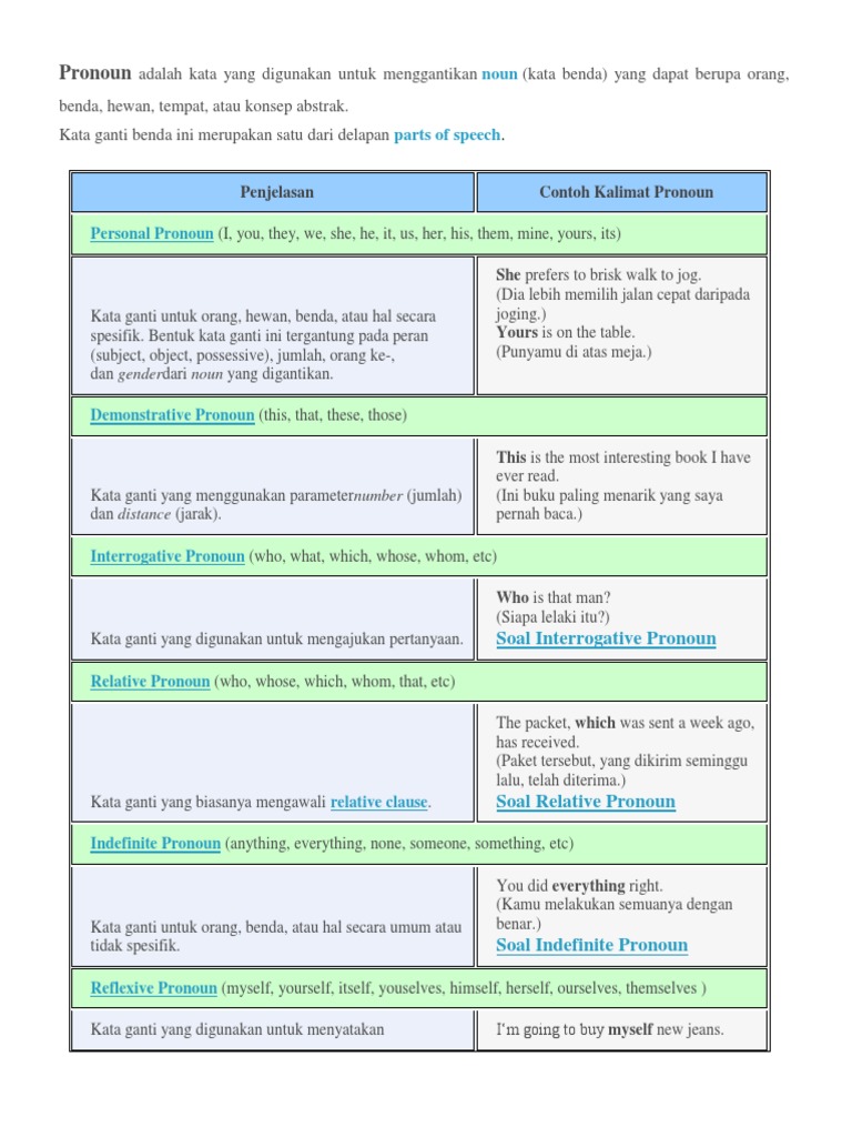 Intensive pronoun adalah kata ganti yang digunakan untuk memberikan penekanan pada antecedent noun atau pronoun lain yang intensive pronoun di suatu kalimat mengarah kepadanya. Reflexive pronoun is a special kind of pronoun. Di bawah saya suguhkan beberapa contoh kalimat dengan relative pronoun dalam bahasa inggris. Ada beberapa macam pronoun yang bisa kita pelajari yakni personal hellip. Kami akan pergi ke pantai akhir minggu iniwe will go to brastagi next month. Pronoun adalah salah satu parts of speech yang berguna untuk menjadikan suatu kalimat menjadi lebih ringkas atau efektif.