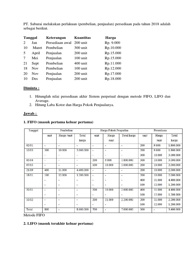 Metode perpetual sistem pencatatan metode perpetual disebut juga metode buku adalah sistem dimana setiap persediaan yang masuk dan keluar dicatat di pembukuan. Setiap jenis barang dibuatkan kartu persediaan dan di dalam pembukuan dibuatkan rekening pembantu persediaan. Biasanya dalam menghitung persediaan akan dihitung pula hpp harga pokok penjualan dan laba kotor. Berikut penjelasan dari kami. Beberapa metode perhitungan persediaan yang populer digunakan adalah metode fifo first in first out lifo last in first out dan average. Metode fifo lifo dan average beserta contoh soal dan penyelesaiannya menghitung persediaan dengan metode fifo lifo dan average itu artinya kita akan menyelesaikannya dengan cara menggunakan dua sistem pencatatan persediaan yaitu sistem perpetual dan sistem periodik.