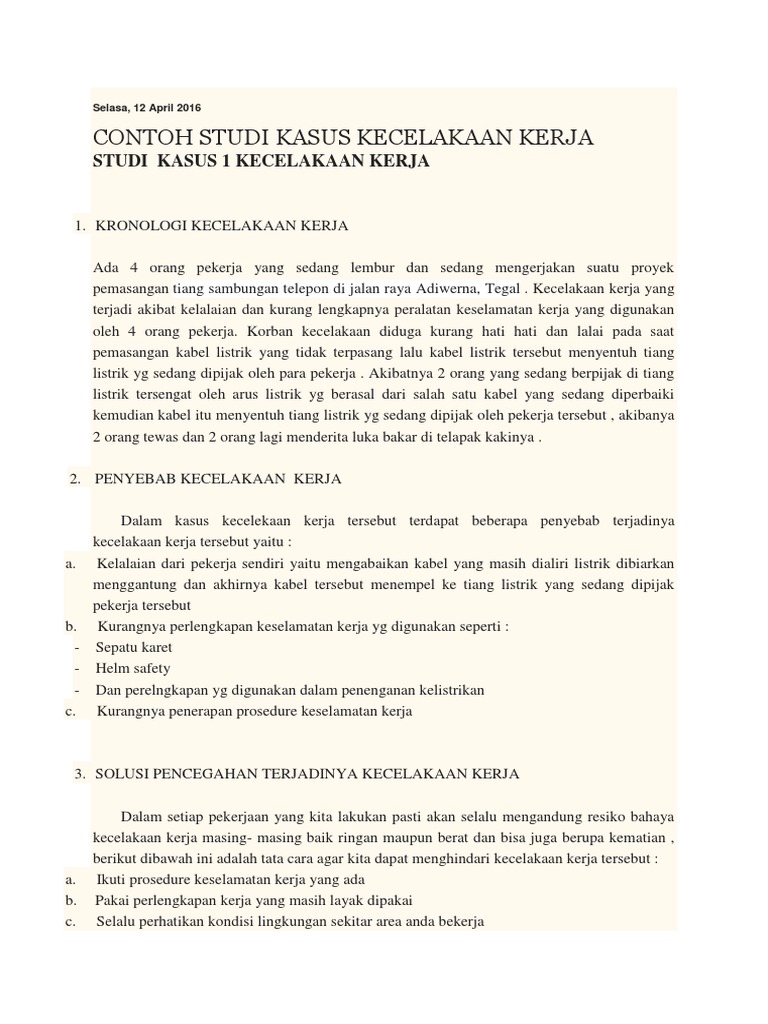 Contoh kasus kecelakaan kerja. Penyelidikan kasus kecelakaan kerja menewaskan 3 pekerja pt enero di kabupaten mojokerto terus bergulir. 3 contoh kasus kecelakaan kerja penyebab kecelakaan kerja dunia usaha indonesia saat ini sedang menghadapi perubahan besar dan cepat sebagai dampak globalisasi dan liberalisasi perdagangan dunia sehingga perlu meningkatkan daya saing dengan memproduksi barang dengan mutu terbaik pada tingkat harga yang kompetitif. Contoh kasus kecelakaan kerja di proyek konstruksi jenis jenis kecelakaan yang dapat terjadi di sektor industri beberapa industri nampaknya harus lebih hati hati dan memperhatikan keselamatan kerja para pegawainya karena beberapa industri di bawah ini adalah industri yang mempunyai tingkat kecelakaan kerja cukup tinggi. Surabaya 20 nov 2019 1800 video. Kecelakaan kerja merupakan kecelakaan yang terjadi akibat adanya hubungan kerja terjadi karena suatu pekerjaan atau melaksanakan pekerjaan. Pada tanggal 3 desember 1984 dinihari sebuah relief valve membuka pada penyimpanan material yang sangat beracun yaitu metal isosianat mic di union carbide india ltd ucil bhopal indiaawan mic yang mengandung mic terlepas ke perumahan dan perkotaan di sekitar pabrik.