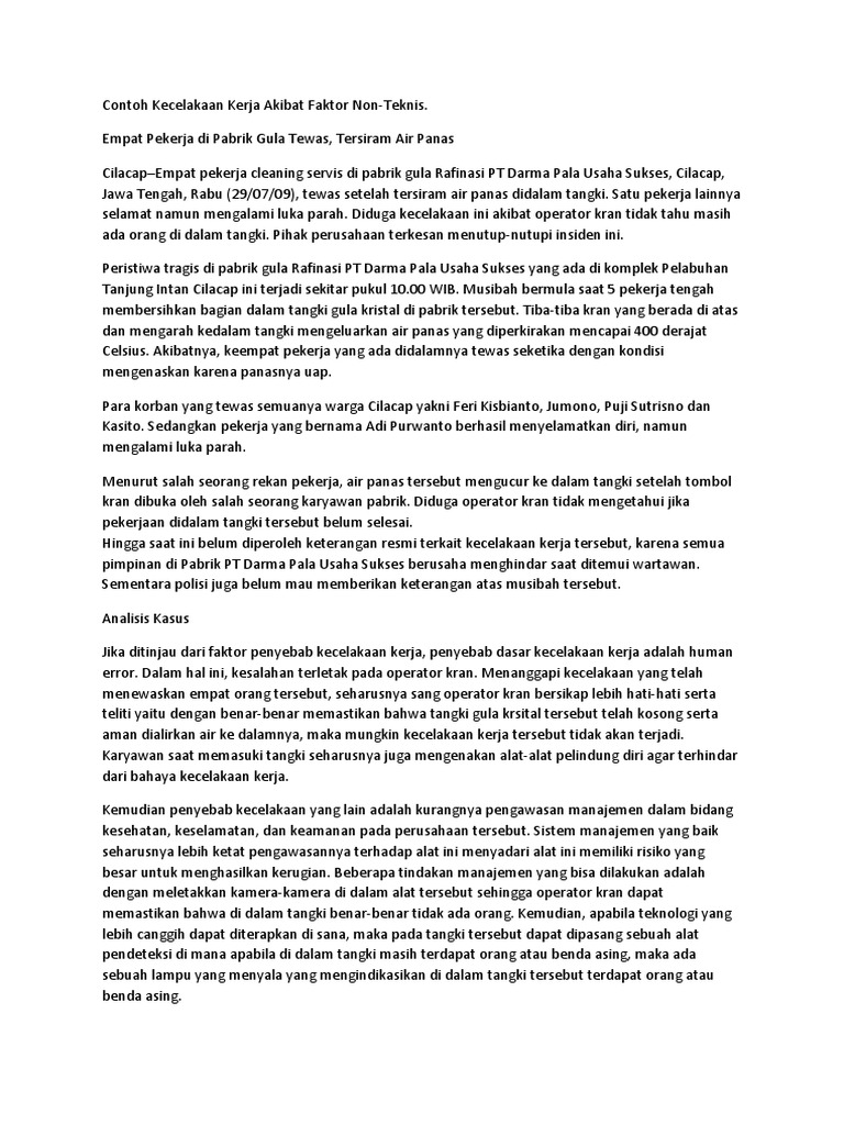 Kementrian ketenagakerjaan sebagai pemegang kebijakan nasional bidang k3 menetapkan lima program dan strategi k3 nasional periode 2020 2024. Detiknews kamis 16 apr 2020 1733 wib apd 3 pekerja pabrik bioetanol mojokerto yang tewas ditemukan di kolam pengendapan. Kecelakaan kerja juga dapat didefinisikan suatu kejadian yang tidak dikehendaki dan tidak diduga semula yang dapat menimbulkan korban manusia dan atau harta benda tentunya hal ini dapat mengakibatkan kerugian jiwa serta kerusakan harta benda. Kecelakaan kerja pada karyawan di mesin dinamo pabrik bagian pakaian korban yang tersangkut puli dinamo yang sedang berputar musibah bermula sebelumnya sekitar pukul 0740 saat akan dilakukan penggantian jam kerja korban mengambil sampel lateks dibagian produksi. Petugas menemukan gas beracun hidrogren sulfida h2s. Empat pekerja di pabrik gula tewas tersiram air panas cilacapempat pekerja cleaning servis di pabrik gula rafinasi pt darma pala usaha sukses cilacap jawa tengah rabu 290709 tewas setelah tersiram air panas didalam tangki.