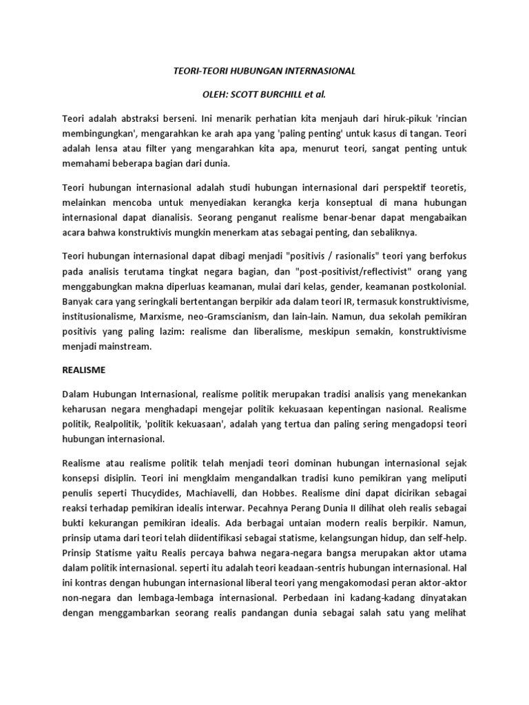 Teori realisme berkembang pada 4 asumsi dasar yakni. Dalam hal ini negara adalah aktor kunci dalam hubungan internasional. Focus dari relisme dimana terdapat dua klaim yang dinamis dalam kestatisan hubungan antar bangsa secara teori dalam world politics pertama negara sebagai actor utama yang dimana actor lain tidak memiliki signifikansi yang. Realisme merupakan salah satu perspektif dalam studi hubungan internasional yang mana menurut jack donnely 2005 p29 mendefinisikan realisme dalam ilmu hubungan internasional sebagai sebuah bentuk tradisi analisis yang terfokus kepada keinginan suatu negara dalam mencapai atau memperoleh kekuatan politik berdasarkan kepentingan nasional dari suatu negara. Contoh kasus hukum laut internasional. Aktor aktor lain seperti individu perusahaan transnasional tnc perusahaan multinasional mnc organisasi internasional mungkin berpengaruh dalam hubungan internasional akan tetapi semua bentuk aktor tersebut diatur oleh negara negara berdaulat.