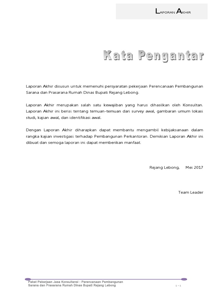 Contoh kata pengantar laporan akhir. Lalu bagaimana ya cara menulis kata pengantar jika untuk laporan praktikum. Kata pengantar tugas akhir dibuat untuk menjelaskan maksud dari penulisan tugas akhir misalnya untuk memenuhi tugas akhir di sekolah. Sayangnya pembuatan kata pengantar kadang kadang diremehkan dan dianggap sepele bahkan dalam penulisannya masih banyak yang dangkal. Biasanya kata pengantar ini berisi penjelasan yang menjabarkan keterangan ucapan terimakasih kepada orang orang yang telah turut membantu menyelesaikan penyusunan tugas akhir tersebut. Kata pengantar laporan sangat penting bagi siswa atau mahasiswa untuk membuat kata pengantar untuk tugas laporan. Dalam menulis karya tulis kata pengantar merupakan komponen yang paling utama serta tidak boleh anda lewatkan begitu saja.