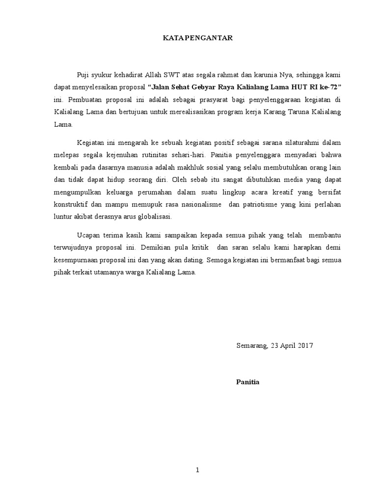Langkah selanjutnya yaitu anda bisa menyiapkan draft awal untuk penyusunan proposal dengan sistematika yang sesuai dengan kampus anda. Mengapa dokumen penjelasan ini dibuat karena pelaku atau pelaksana kegiatan. Contoh kata pengantar laporan. Biasanya pembuatan proposal dimaksudkan untuk menjelaskan kepada pihak tertentu akan adanya sebuah kegiatan yang akan dilaksanakan pada waktu yang akan datang. Proposal lazimnya dikenal sebagai sebuah dokumen yang berisi rencana kegiatan yang terancang secara sistematis dan terperinci.
