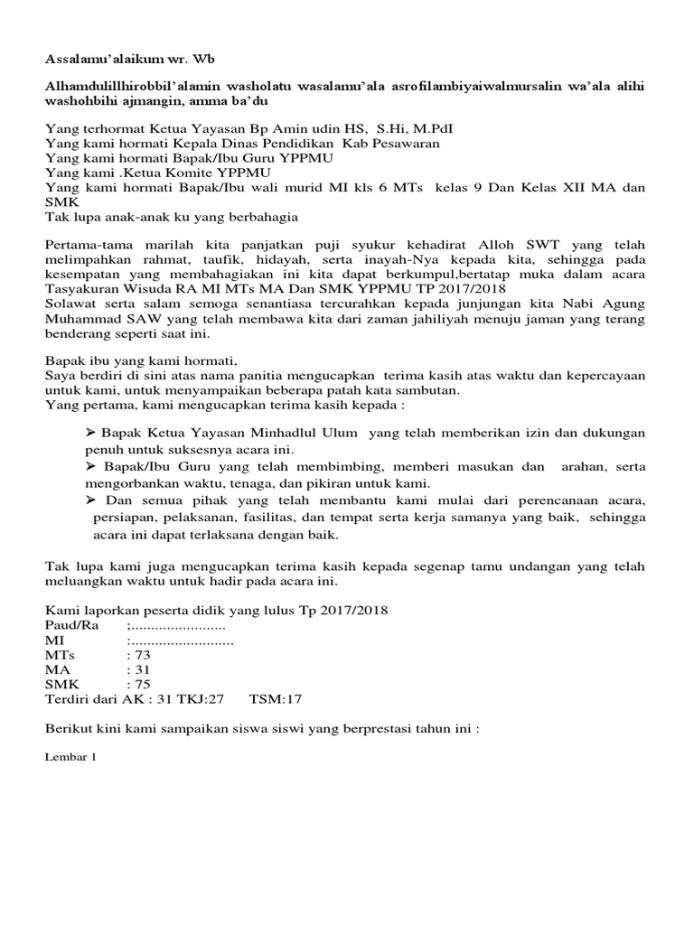 Tertalu letih tubuh ini berjalan menelusuri ribuan detik yang terhampar. Dan orang yang setia akan angkat kaki ketika sabar perduli dan setianya tidak lagi dihargai. Meskipun singkat namun kata kata pidatonya dijamin sangat mengharukan sehingga bisa membuat pendengar merasakan bagaimana harunya yang namanya perpisahan. Dan apabila ada kekurangan kekeliruan kata dalam penulisan sambutan perpisahan kelulusan oleh wali kelas ini kalian berhak mengedit naskah pidato ini atau menambahkan kata kata agar lebih baik dan lebih sempurna lagi menurut kalian. Contoh kata sambutan kita tentunya sudah pernah menghadiri suatu acara baik itu formal atau nonformal nah dalam suatu acara tersebut banyak sekali kita lihat kata sambutan yang biasanya disampaikan oleh tokoh penting dalam suatu acara tersebut misalkan acara perpisahan sekolah biasanya akan ada kata sambutan dari kepala sekolah. Wb selamat pagi dan salam sejahtera.