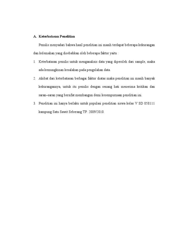 Contoh keterbatasan penelitian kuantitatif. Tujuan penelitian tujuan penelitian diungkapkan pada sasaran yang ingin dicapai dalam penelitian. Tujuan penelitian mengacu pada rumusan penelitian dan berupa pernyataan. Ruang lingkup dan keterbatasan penelitian. Asumsi substantif berhubungan dengan permasalahan penelitian sedangkan asumsi metodologis berkenaan dengan metodologi penelitian. Kegiatan mendeskripsikan data adalah menggambarkan data yang ada guna memperoleh bentuk nyata dari responden sehingga lebih mudah dimengerti peneliti atau orang lain yang tertarik dengan hasil penelitian yang dilakukan. Berikut ini adalah download jurnal gratis yang merupakan kumpulan file dari berbagi sumber tentang keterbatasan penelitian ilmiah yang bisa bapakibu gunakan dan diunduh secara gratis dengan menekan tombol download biru dibawah ini.