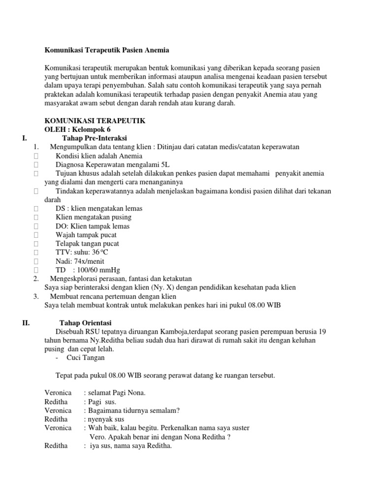 Contoh komunikasi terapeutik komunikasi terapeutik. Dialog komunikasi terapeutik perawat dan pasien fase prainteraksi pada rumah sakit x di kamar y terdapat seorang pasien yang bernama odilia dewi dacosta umur 21 tahun dimana ia sekarang sedang menempuh pendidikan tinggi di salah satu universitas swasta yang berada di daerah z di rumah sakit tersebut ia ditemani oleh ibunya yang bernama rika dimana odilia tersebut sedang menjalani perawatan. Mm menganggukkan kepala iya ibu itu memang efek dari luka yang ibu alamikarena pada luka ibu terjadi respon peradangan. Memberitahu pada pasien bahwa pakaian atas harus dibuka kemudian menutup dengan selimut mandi kain penutup berdiri di sisikanan atau kiri pasien. Komunikasi terapeutik termasuk komunikasi interpersonal dengan titik tolak saling memberikan pengertian antar terapis dengan pasien. Sejak kecelakaan kemarin luka dibagian lutut saya masih agak sedikit nyeri mbakmenyentuh lutut dan merenung perawat.