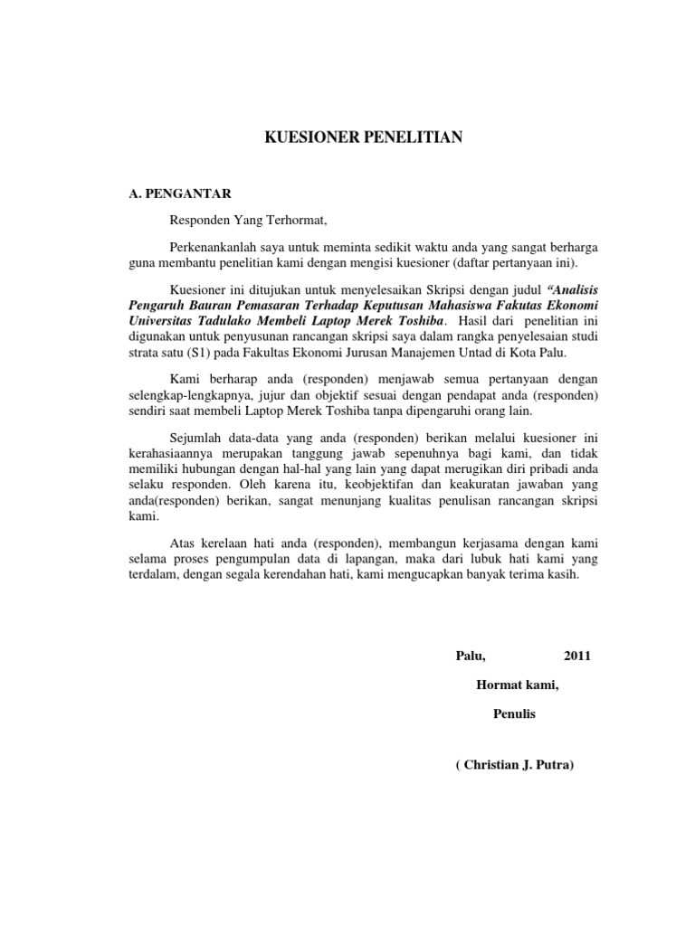 Contoh kuesioner penelitian angket penelitian buat kamu yang mau melakukan penelitian di bawah ini saya berikan contoh kuesioner penelitian oleh salah satu mahasiswa di suatu kampus. Bauran pemasaran dan keputusan pembelian kuesioner ini disusun pada tahun 2007 dan telah sedikit dimodifikasi yaitu sebagai instrumen penelitian yang berjudul.