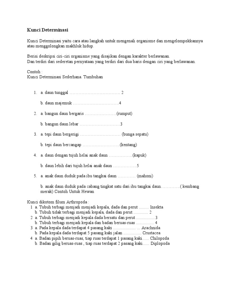 Contoh kunci determinasi tumbuhan lengkap. Pengertian dikotomi hewan dan tumbuhan lengkap kunci determinasi ialah suatu kunci yang dipakai untuk identifikasi makhluk hidup berupa keterangan wacana ciri ciri makhluk hidupidentifikasi merupakan aktivitas dasar dalam taksonomi. Pengertian dan contoh kunci determinasi dikotomi hewan dan tumbuhan lengkap dengan cara menggunakannya oleh berpendidikan diposting pada 28 januari 2016 16 maret 2019. Kunci dikotom berisi deskripsi atau ciri ciri makhluk hidup yang terdiri dari dua baris dengan ciri yang kontradiktif atau berlawanan. Kunci determinasi dengan dikotomi berupa urutan nomor dan memuat dua daftar ciri makhluk hidup kunci determinasi diperkenalkan carolus linnaeus namun sebenarnya lammarck pada tahun 1778 yang memakai kunci modern untuk identifikasi. Contoh urutan kunci determinasi. Berikut ini adaalh beberapa saran saran didalam penggunaan sebuah kunci determinasi yaitu.