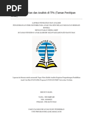 Disetujui sebagai laporan dan analisis mata kuliah analisis kegiatan pengembangan pendidikan anak usia dini. Laporan ini disusun untuk diajukan memenuhi tugas mata kuliah analisis kegiatan pengembangan pendidikan anak usia dini pada program strata 1 pendidikan guru pendidikan anak usia dini di fakultas keguruan dan ilmu pendidikan universitas terbuka. B ahwa dalam proses di tpa hendaknya pengasuh memberikan kesempatan seluas luasnya pada semua anak untuk mendapat stimulasi yang tepat oleh lingkungannya. Laporan penelitian ini disusun dalam rangka memperoleh nilai mata kuliah analisis kegiatan pengembangan kemampuan pendidikan anak usia dini yang merupakan mata kuliah bagi mahasiswa fakultas keguruan ilmu pendidikan universitas terbuka upbjj semarang. Di mana diperlukan menyarankan tindakan perbaikan yang sesuai dan hemat biaya 2. Pengembangan kegiatan anak usia dini melukis dengan kelereng.