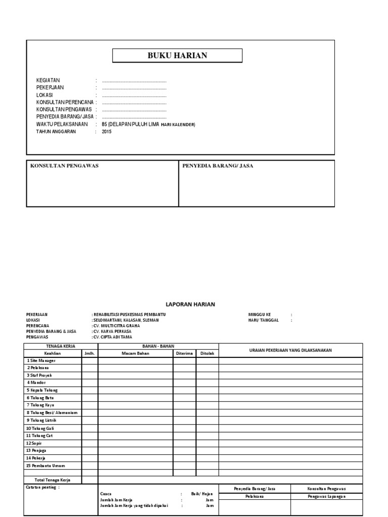 Admin blog kumpulan contoh laporan 2019 juga mengumpulkan gambar gambar lainnya terkait contoh laporan akhir konsultan pengawas bangunan dibawah ini. Konsultan pengawas adalah pihak yang ditunjuk oleh pemilik proyek owner untuk melaksanakan pekerjaan pengawasan. Selamat datang halaman blog ini menyediakan file file contoh format laporan harian mingguan bulanan ataupun laporan pendahuluan dan akhir dari suatu proyek konstruksi atau perencanaan proyek konstruksi serta format format formulir proyek lainnya yang mungkin anda butuhkan dalam pekerjaan proyek atau pengelolaan sebuah proyek manajemen proyek maupun untuk keperluan literatur pembuatan. 1 1 upvote mark this document as useful 0 0 downvotes mark this document as not useful embed. Laporan harian pengawasan kegiatan. Download contoh laporan konsultan pengawas kali ini saya akan memberikan kepada kalian semua contoh format excel laporan bulanan mingguan harian dan jadwal pelaksanaan untuk konsultan pengawas.