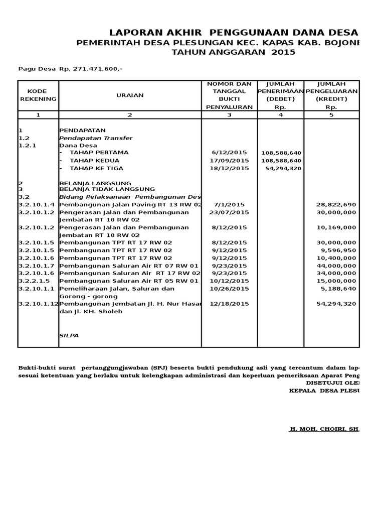 J o xx26xlsx format format pelaporan keuangan desa. Contoh laporan pertanggung jawaban lpj bantuan dana desa kata pengantar dengan memanjatkan fuji dan syukur kehadirat alloh swt atas segala rahmat dan karunia nya kami dapat menyelesaikan program kegiatan sebagaimana yang kita harapkan dengan telah selesainya pelaksanaan kegiatan bantuan dana desa tahap 1 tahun 2015. Laporan realisasi anggaran desa dijelaskan lebih lanjut dalam catatan atas laporan keuangan desapenjelasan tersebut memuat hal hal yang mempengaruhi pelaksanaan anggaran seperti sebab sebab terjadinya perbedaan yang material antara anggaran dan realisasinya serta daftar daftar yang merinci lebih lanjut angka angka yang dianggap perlu untuk dijelaskan. Karenanya pembukuan seperti laporan keuangan bulanan dd tentu saja harus mengacu pada aturan. Dah siapkan anda dengan laporan keuangan desa atau umumnya dikenal spj tahunan desa anda mungkin sebagian sudah sebagian lagi belum desa gua aja lagi sibuk sibuknya nih bikin laporan keuangan. T1 contoh perdes peraturan desa laporan pertanggungjawaban apbdes nama file.