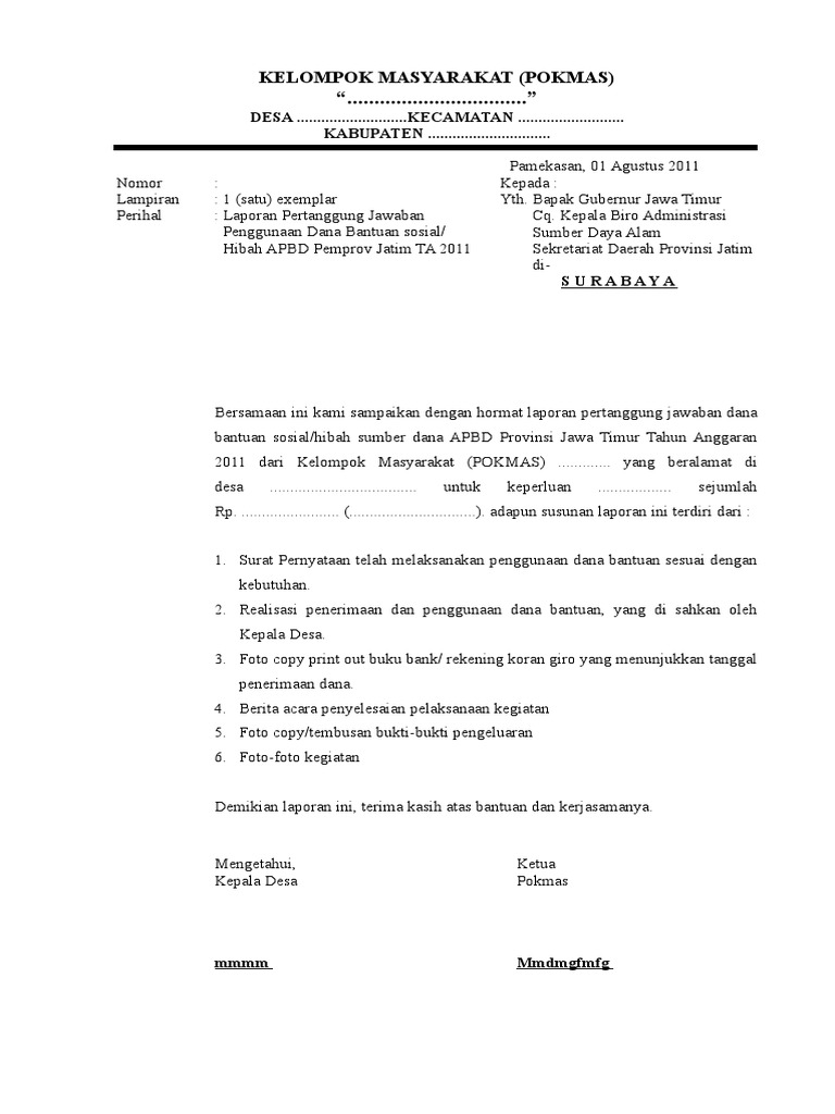 Contoh laporan pertanggungjawaban penggunaan dana hibah. Adapun rincian anggaran dana hibah dan bantuan sosial dapat dilihat pada tabel 1 dibawah ini. Pengertian dana hibah menurut pengertian yang tertera di wwwdanahibahwebid hibah adalah pemberian bantuan uangbarang atau jasa dari pemerintah daerah kepada pemerintah atau pemerintah daerah lainnya perusahaan daerah masyarakat dan organisasi kemasyarakatan yang. Dan belanja daerah dan peraturan perundang undangan yang berlaku serta saya akan bertanggung jawab mutlak terhadap penggunaan dana hibah dimaksud. Laporan pertanggungjawaban dana hibah. Surabaya 5 oktober 2014. Sehubungan dengan pemberian dana hibah dari pemerintah kabupaten bantul kepada masjid al musyahadah di dusun xi jogonalan kidul tirtonirmolo kasihan bantul sebanyak rp 5000000 lima juta rupiah maka dari itu kami atas nama panitia dan pengurus takmir masjid al musyahadah memberikan laporan pertanggungjawaban tentang dana hibah yang rinciannya terlampir bersama surat ini.