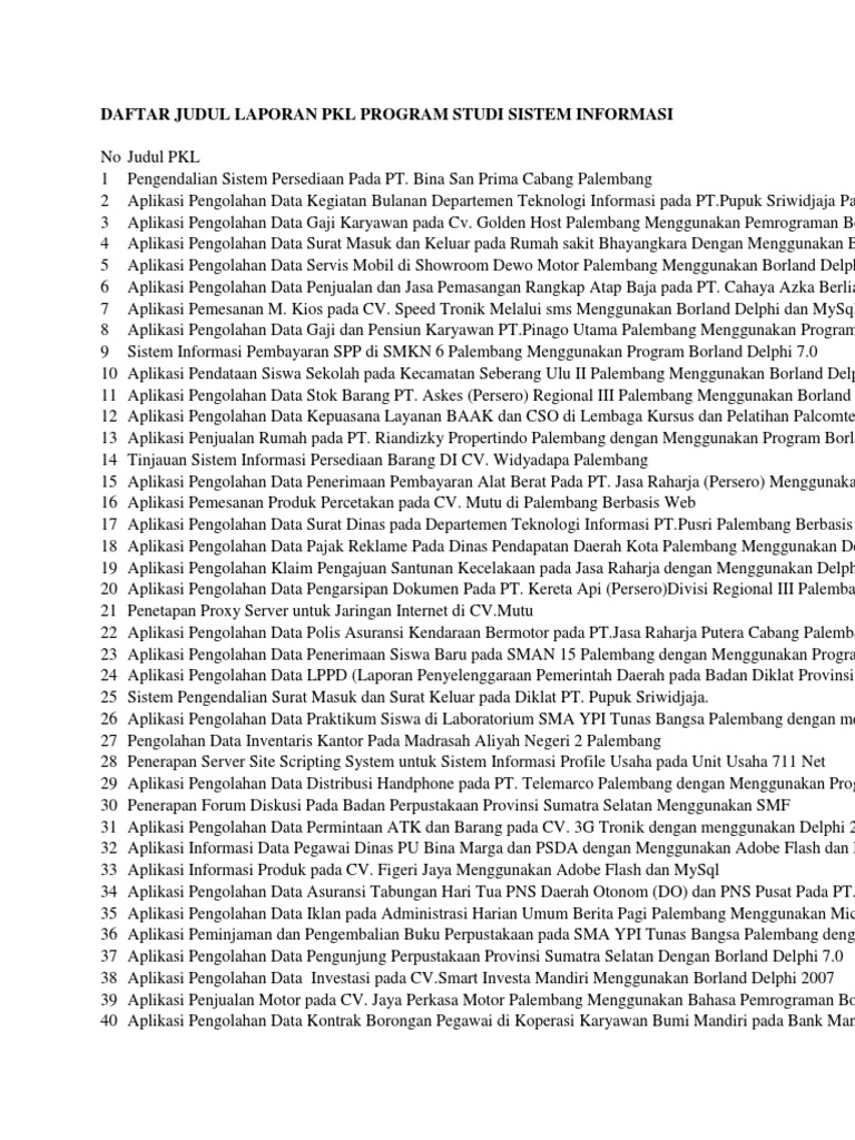 Contoh laporan pkl sistem informasi pengolahan data. Karena dengan teknologi dapat membantu kelancaran dalam pengolahan data menjadi suatu informasi yang sangat dibutuhkan oleh semua pihak terutama untuk kegiatan operasional perusahaan. Contoh laporan pkn sistem pengolahan data pegawai dinas perhubungan kabupaten pasuruan menggunakan delphi 7. Laporan praktek kerja lapangan pkl ditulis berdasarkan informasi yang di data dari berbagai pihak selama pelaksanaan praktek kerja lapangan pkl pada tanggal 01 agustus sd 31 agustus 2006 di bag. Dari metode dan langkah langkah yang dilakukan pada tahapan analisis sistem dalam mengidentifikasikan masalah yang ada maka di anggap perlu untuk melakukan proses pengembangan sistem yaitu dengan membuat suatu aplikasi pengolahan data pegawai dengan digunakan program visual basic 60 sehingga muda di pahami dinamis dan memungkinkan pengguna dapat berintegrasi dengan aplikasi tersebut serta. Laporan pkl sistem informasi pengolahan data laporan bulanan penyakit tidak menular di dinas kesehatan provsu filkom usmi. Dengan kamus data dapat mendefinisikan data pada sistem dengan lengkap pada sistem yang dikembangkan.