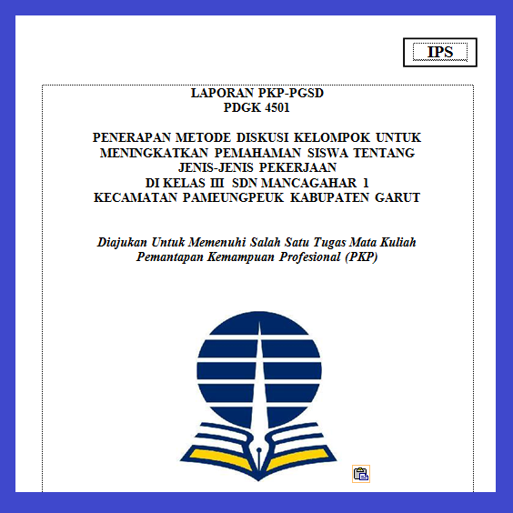 Laporan pkp 1 abstrak siswa di kelas i sd muhammadiyah i marapalam padang masih banyak yang belum mampu membaca dan menulis dengan tepat. Alamat email anda tidak akan dipublikasikan. Seperti halnya pkm mata kuliah pkp merupakan salah satu mata kuliah muara program bagi mahasiswa yang mengikuti program pendidikan keguruan di fkip ut. Pdgk 4501 pada program studi s i pgsd fkip universitas terbuka. Tinggalkan balasan batalkan balasan. Tentunya kami berharap bahwa laporan yang kami bagikan ini bisa berguna untuk anda sehingga nantinya dalam pembuatan laporan pkp anda memberikan kemudahan untuk anda.
