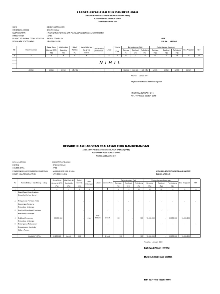 Anggaran pendapatan dan belanja daerah apbd kabupaten hulu sungai utara tahun anggaran 2014. Laporan realisasi fisik dan keuangan ta. Skpd sub bagian subbid nama kegiatan sumber dana pejabat pelaksana teknis kegiatan bendahara pengeluaran. Dppkad bulan 1 28 des 2011 no pekerjaan rencana lokasi anggaran kontrak adendum sisa nama sisa ket paket. Penyusunan laporan keuangan pemerintah daerah lkpd merupakan kewajiban pemda untuk menyediakan informasi yang relevan mengenai posisi keuangan dan seluruh transaksi yang dilakukan oleh pemda selamat satu periode pelaporan. Laporan realisasi fisik dan keuangan.